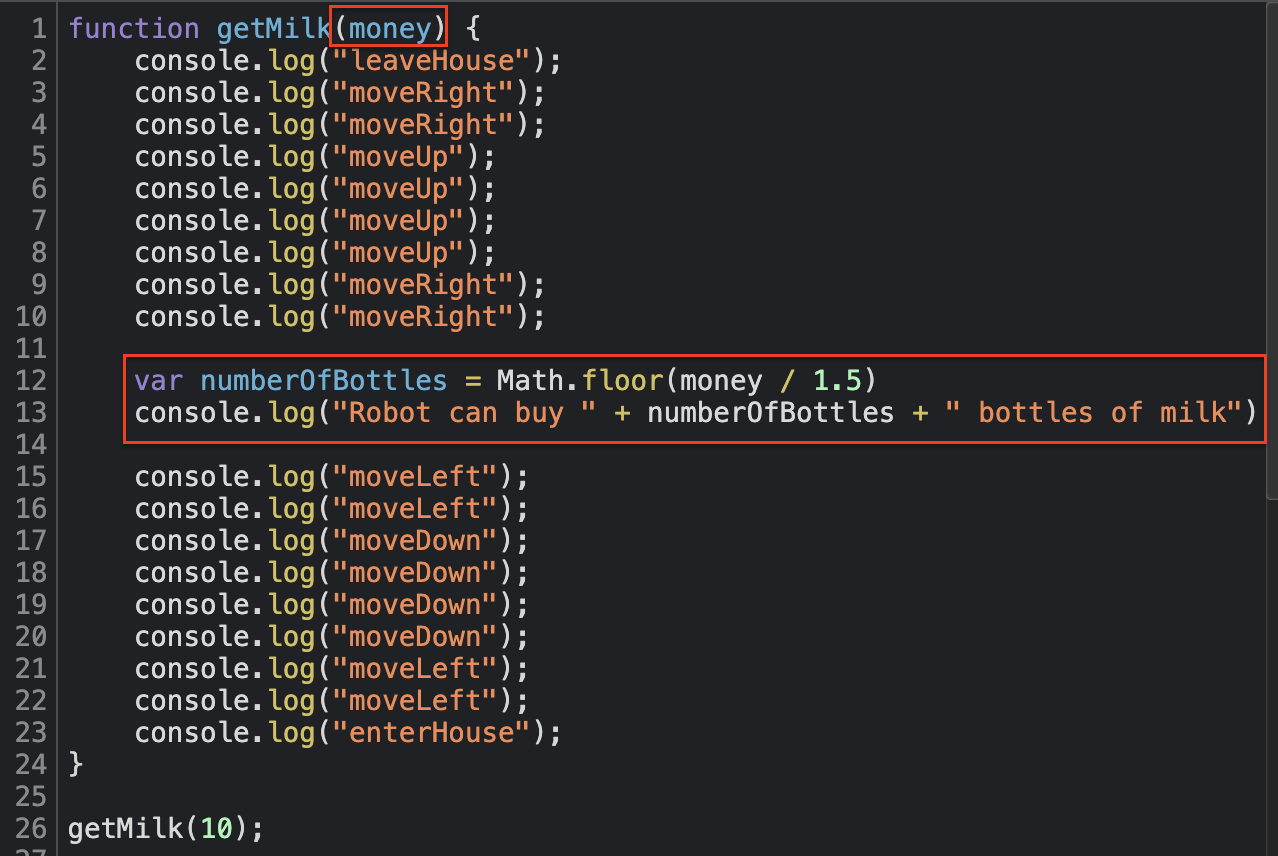 console.log("buy "+ calcBottles(money, costPerBottle) +" bottles of milk.")