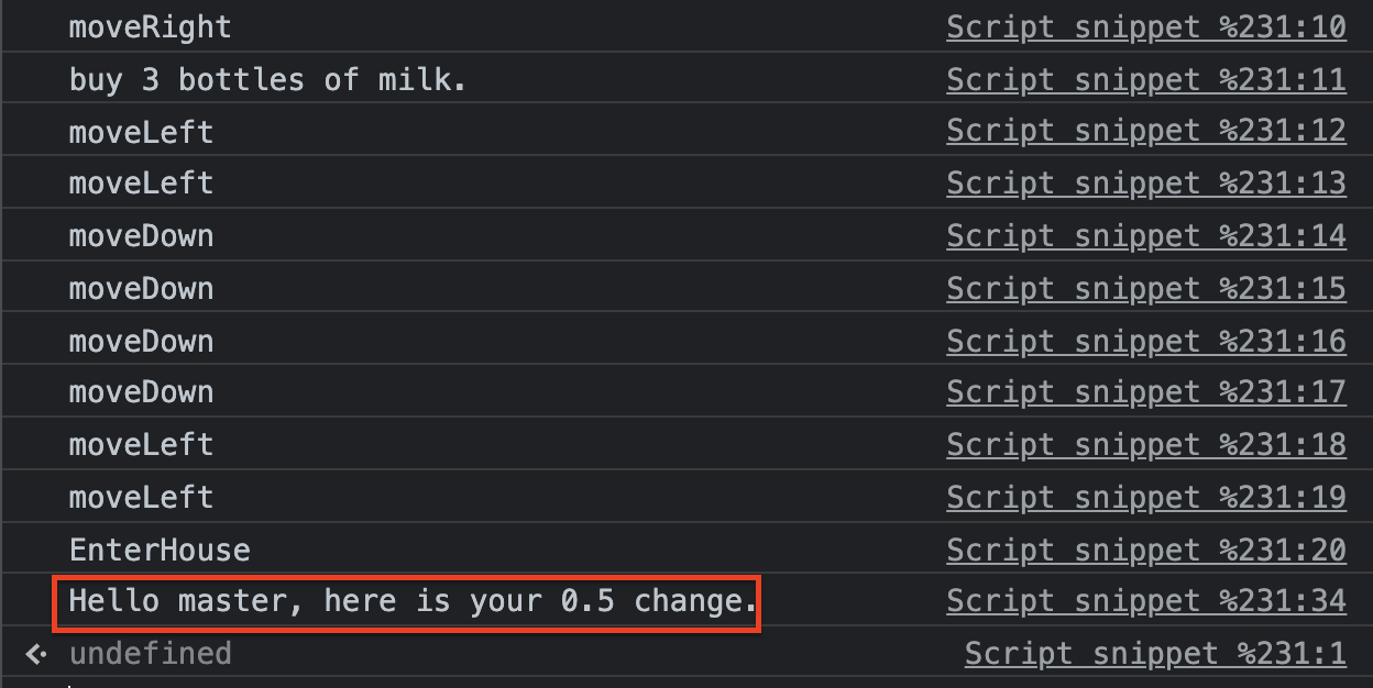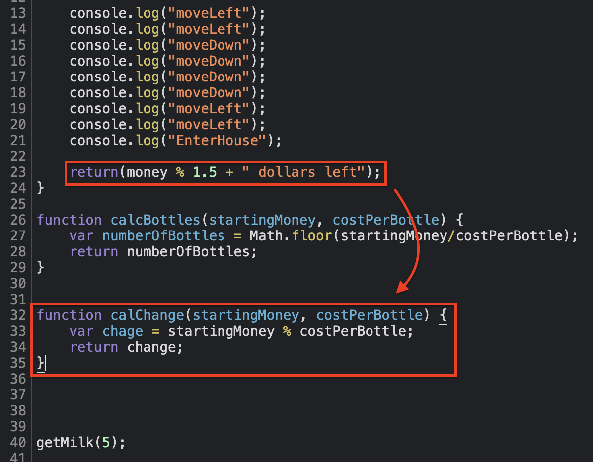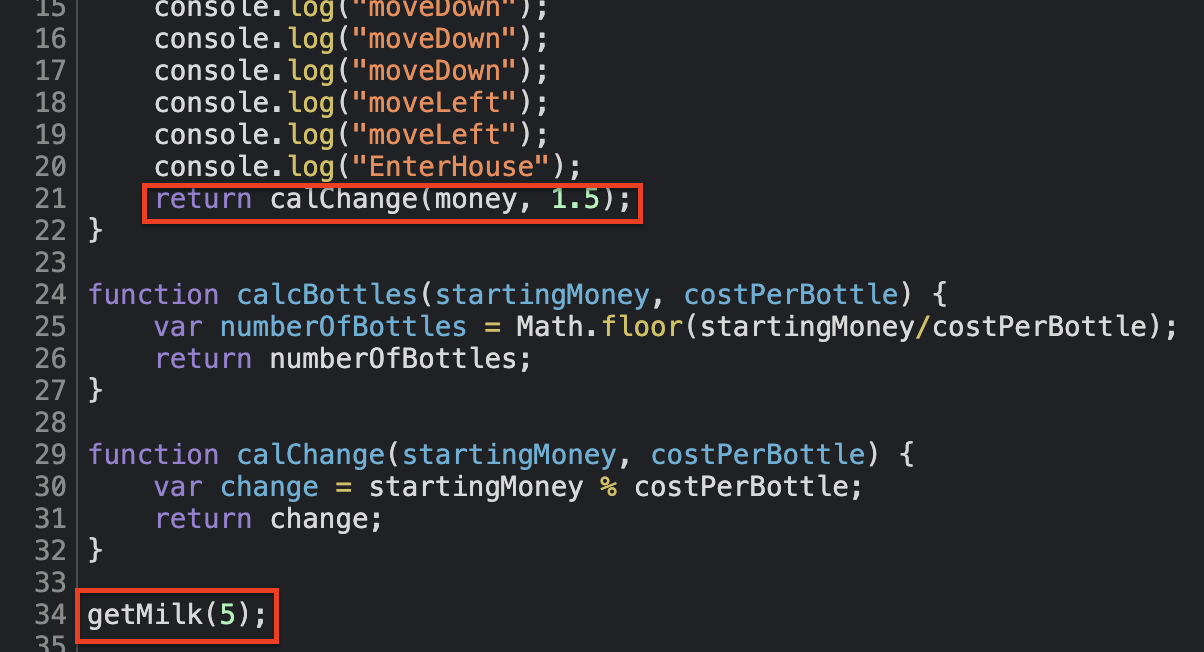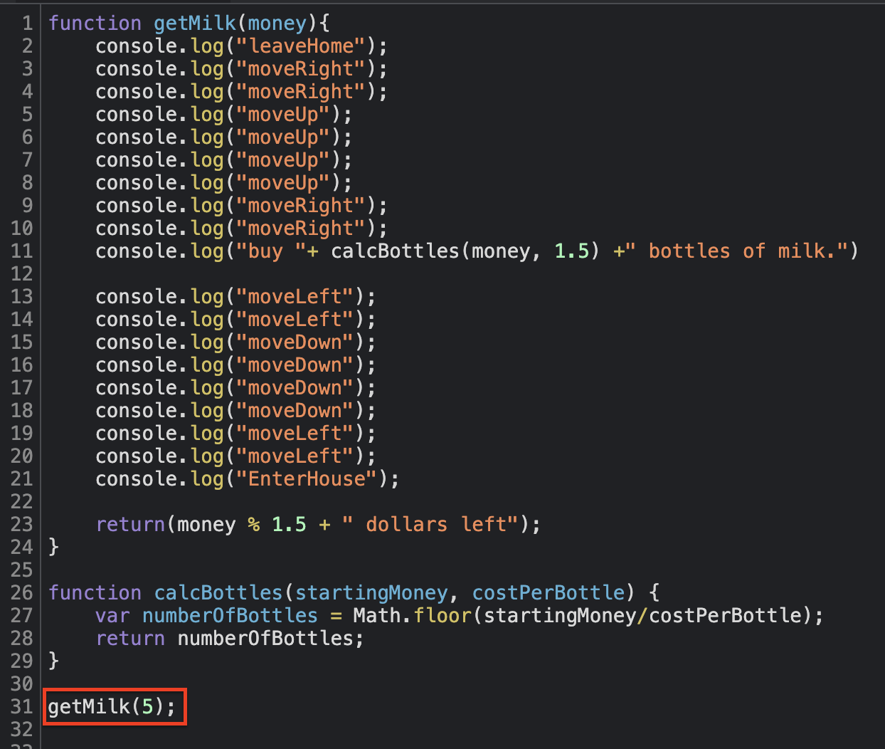console.log("Hello master, here is your " + getMilk(5, 1.5)+ " change.");