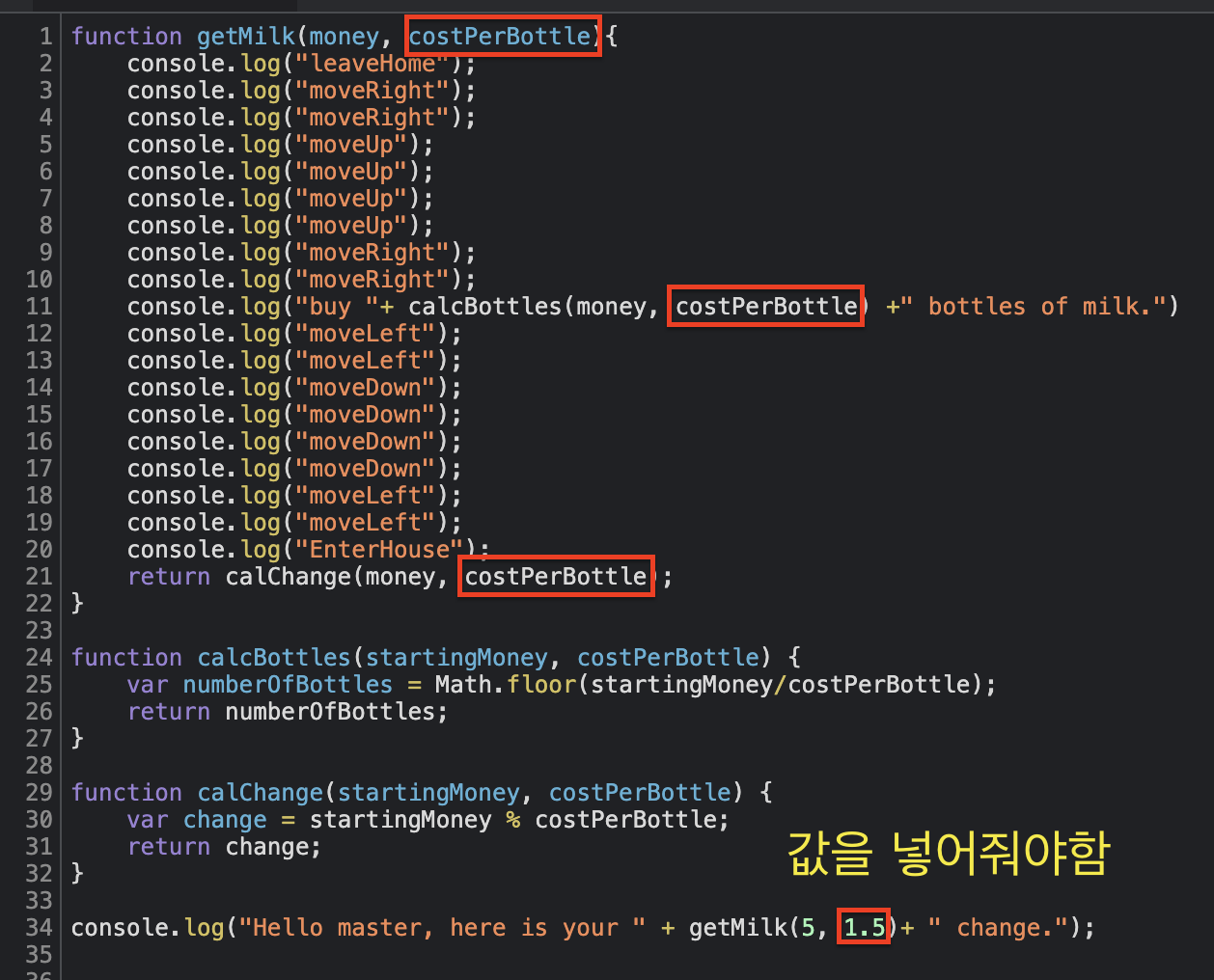 괄호안에 (money, 1.5)는 순서대로 (startingMoney, costPerBottle)로 채워져서 계산된다.