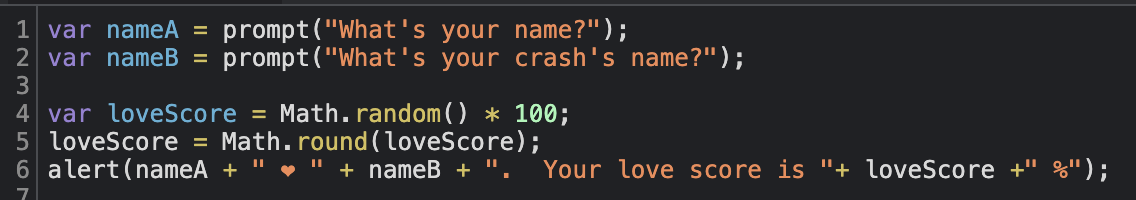 alert(nameA + " ❤ " + nameB + ". Your love score is "+ loveScore +" %");