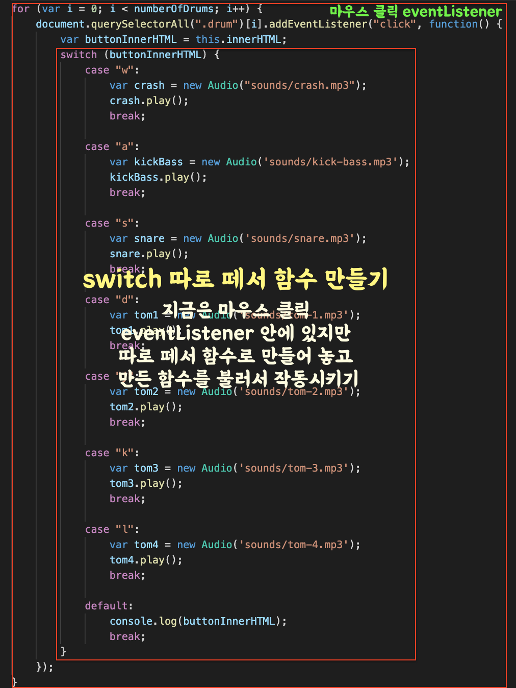 6-2) 각 소리와 연결된 파일을 밖으로 빼서 새로 만든 makeSound() 함수 안에 넣는다.