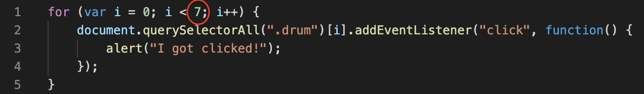 for loop으로 drum 클래스에 인덱스 0~6까지 하나씩 EventListener 효과를 주었다.
