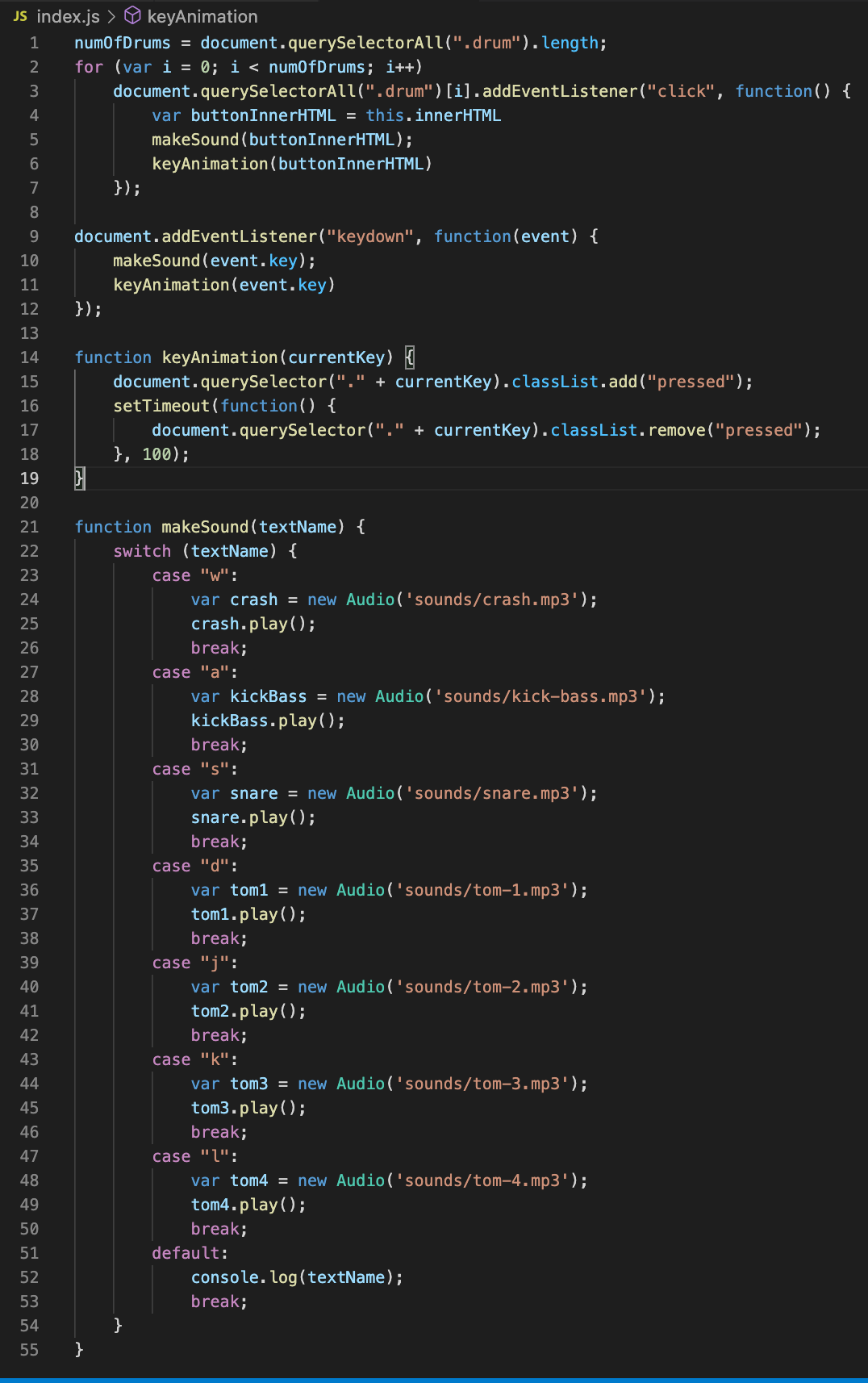 6-2) 각 소리와 연결된 파일을 밖으로 빼서 새로 만든 makeSound() 함수 안에 넣는다.