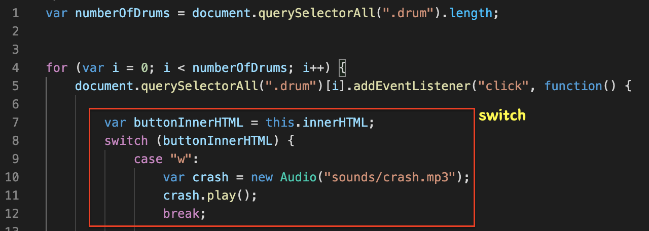 각 버튼에 다른 소리가 나게 하려면 switch statement가 필요하다.
