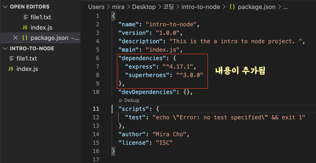 package.json을 보면 다운받은 패키지가 추가되어있다.