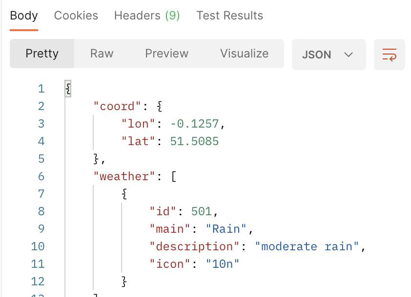 "weather = {id: 501, main: "Rain", description: "moderate rain", icon: "10n"}"