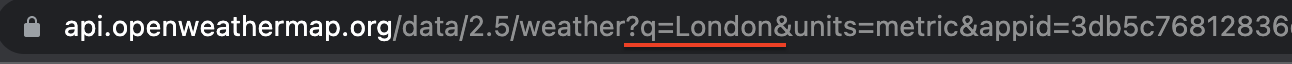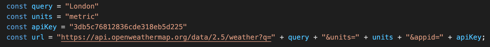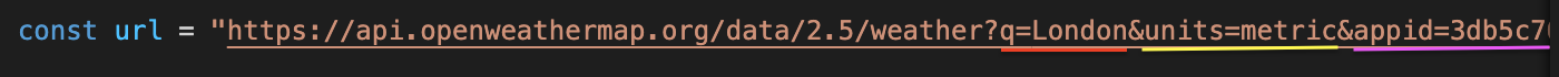 const url = "https://api.openweathermap.org/data/2.5/weather?q=" + query + "&units=" + units + "&appid=" + apiKey;