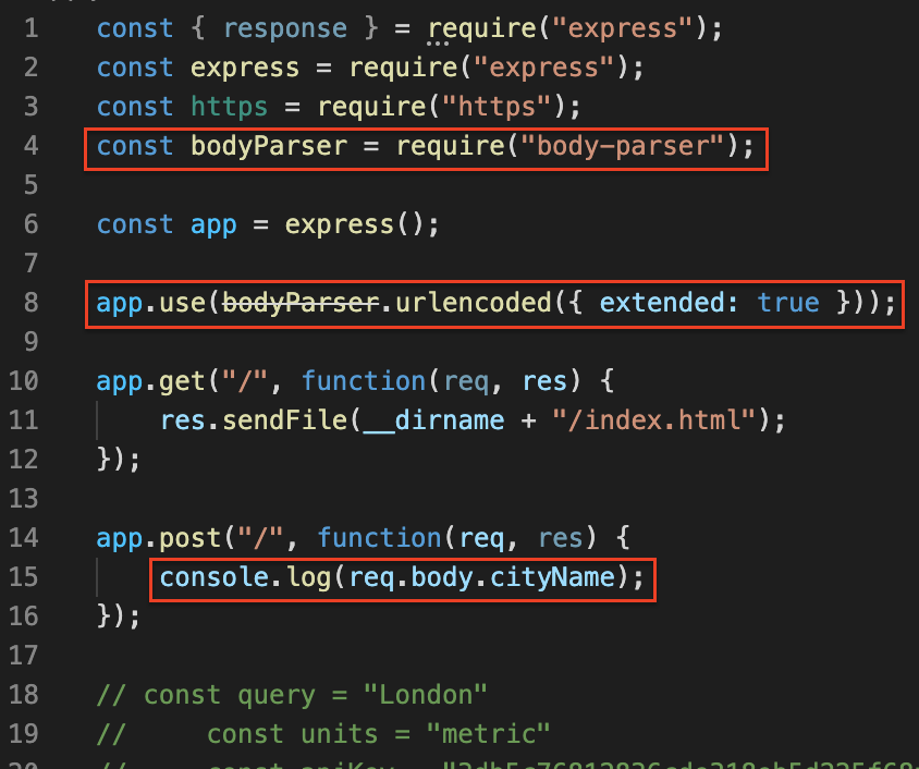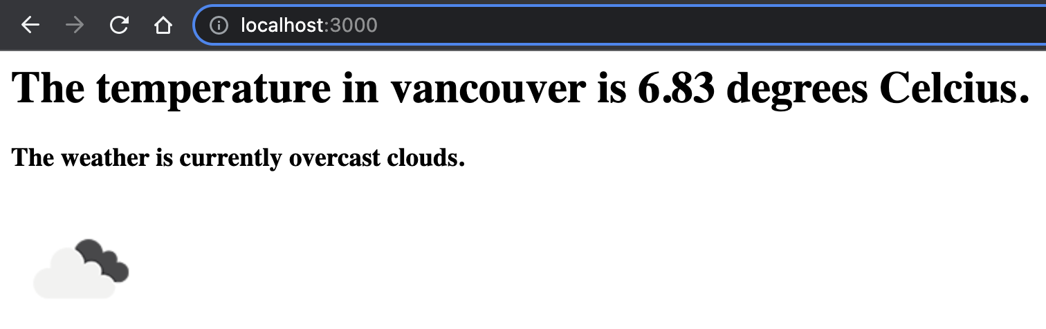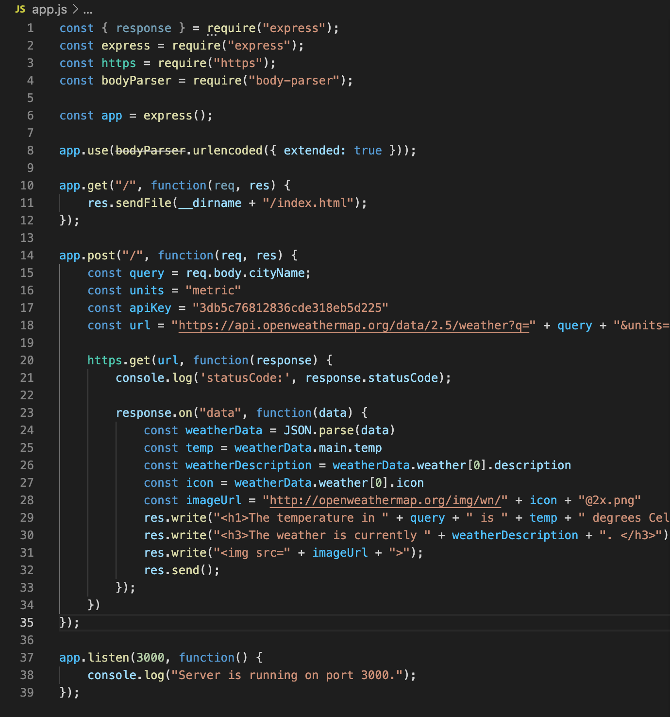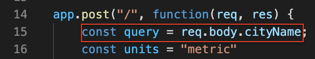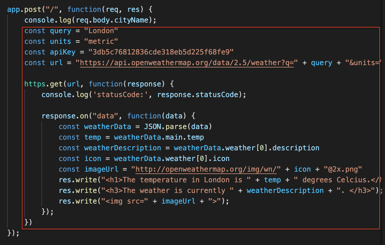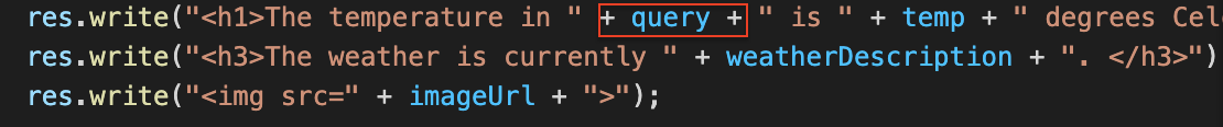res.write("<h1>The temperature in " + query + " is " + temp + " degrees Celcius.</h1>");