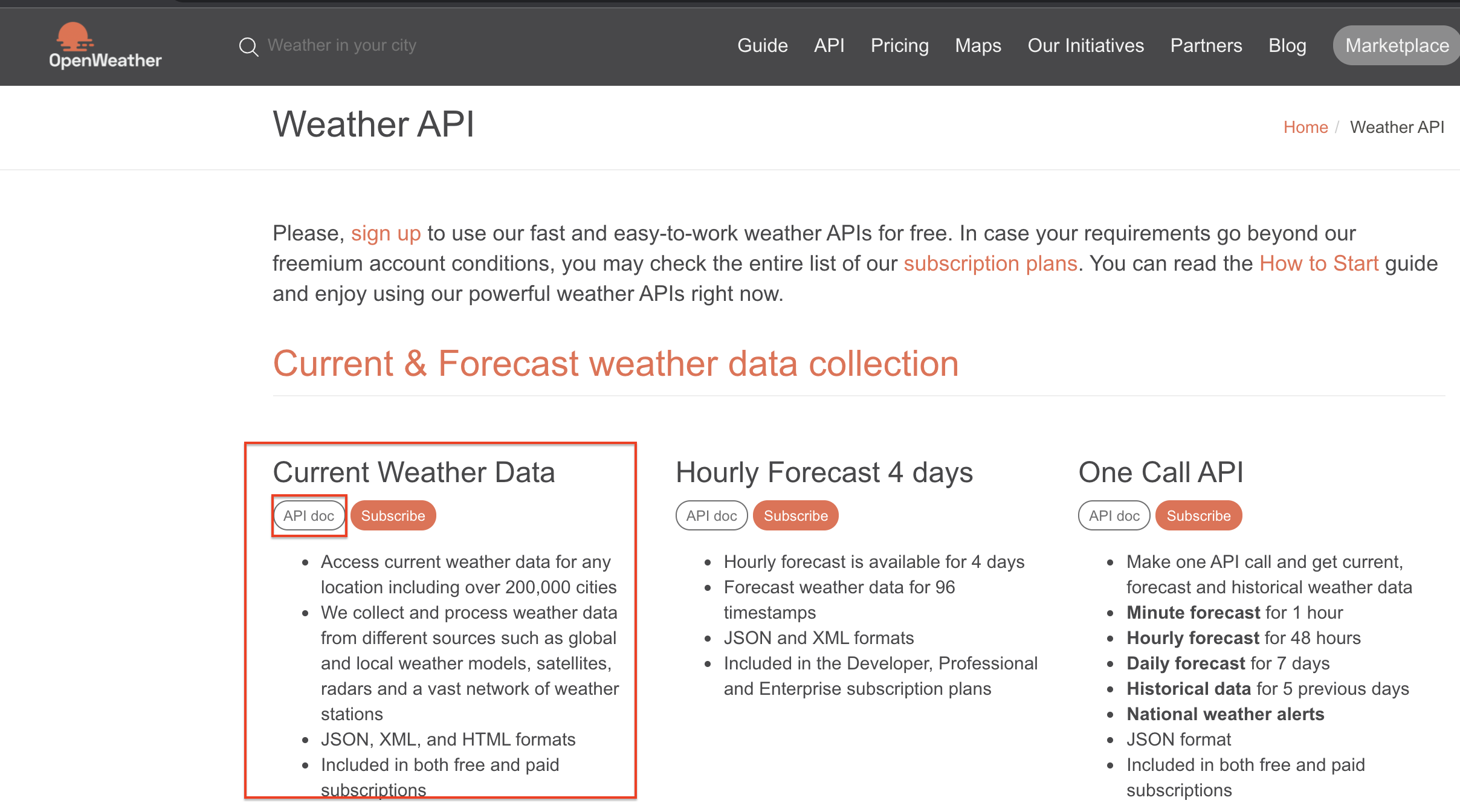 현재 날씨를 볼 수있는 데이터 API doc을 눌러 들어갔다.