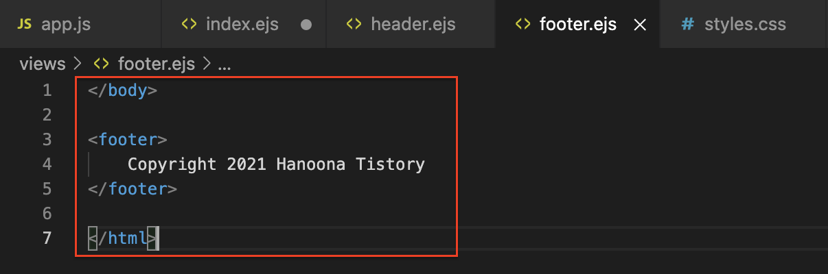 footer.ejs에도 마찬가지도 하단 부분을 잘라서 붙여준다.