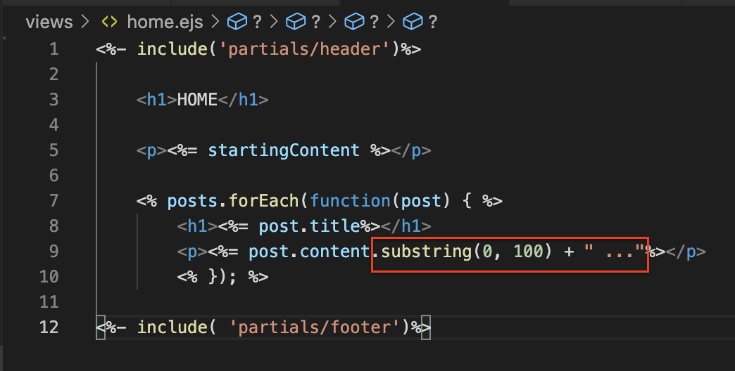<p><%= post.content.substring(0, 100) + " ..."%></p>