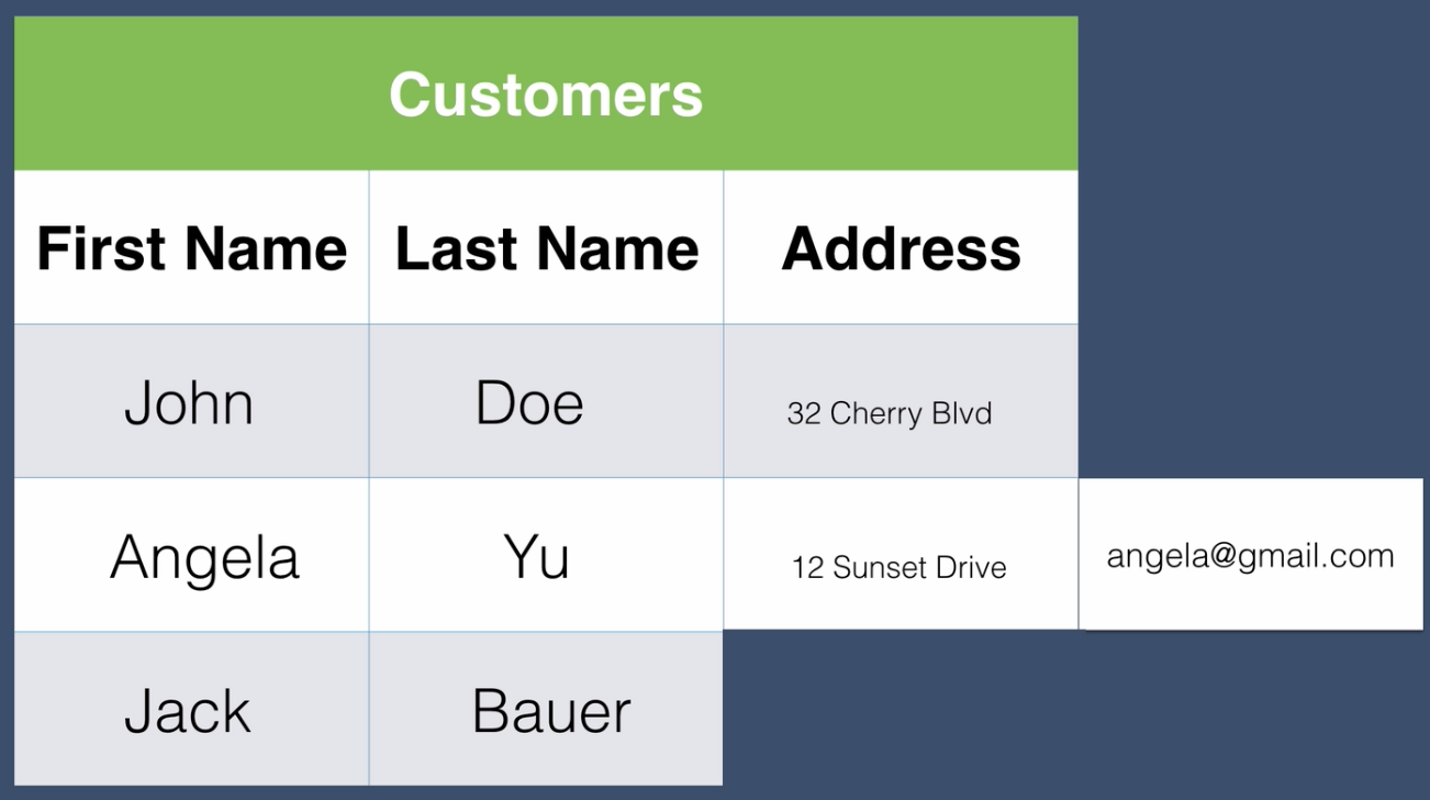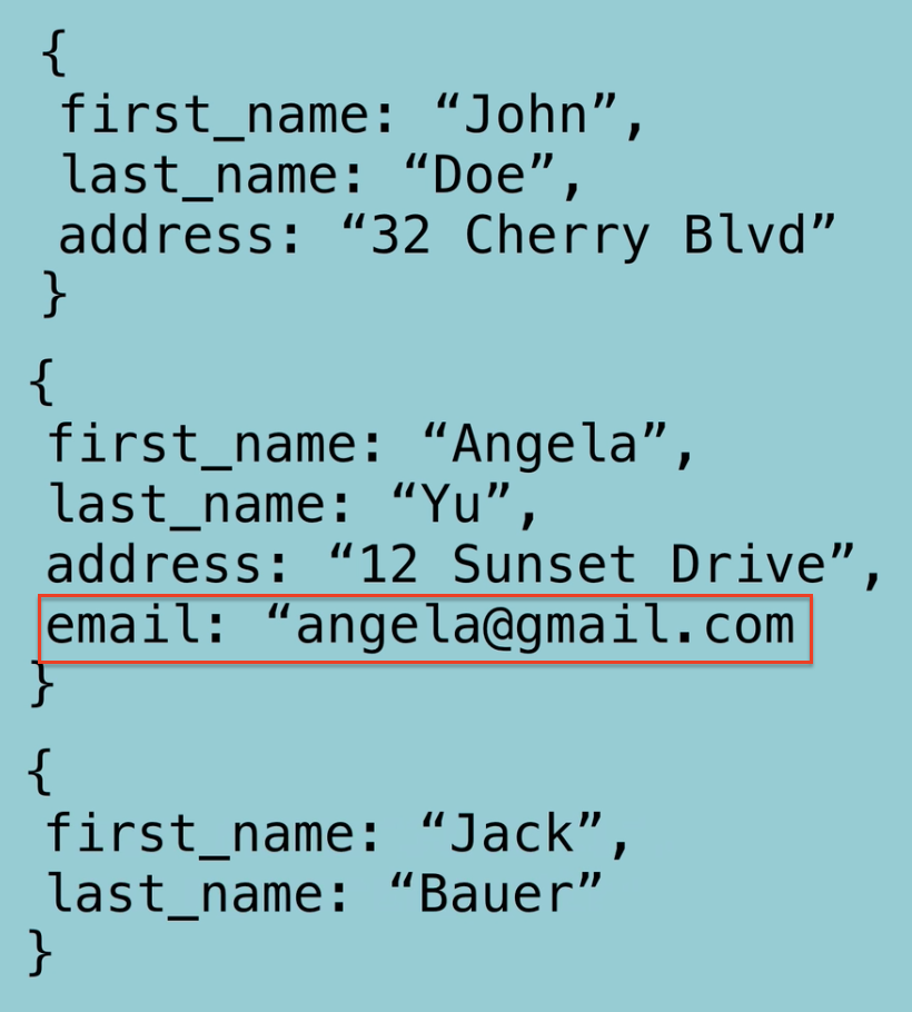 각각의 기록 또는 각 표에서의 줄은 json object로 되어 있어 분산된 형태를 가지고 있다.