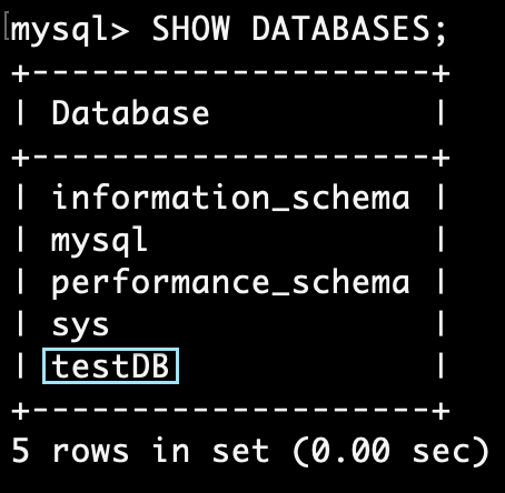 testDB가 만들어져 있는 것을 볼 수 있다.