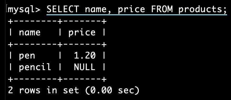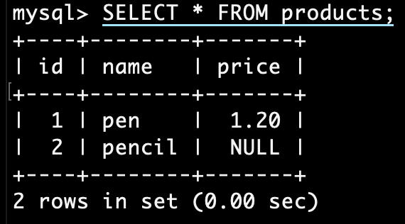 -> VALUES (1, "pen", 1.20);