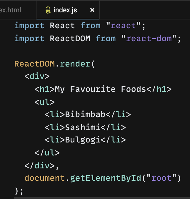 지금까지는 HTML, CSS, JS를 각자 파일에서 따로 코딩하였지만 JSX는 모두 모아 코딩할 수 있다.