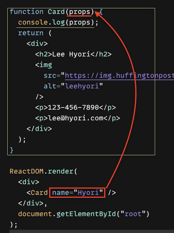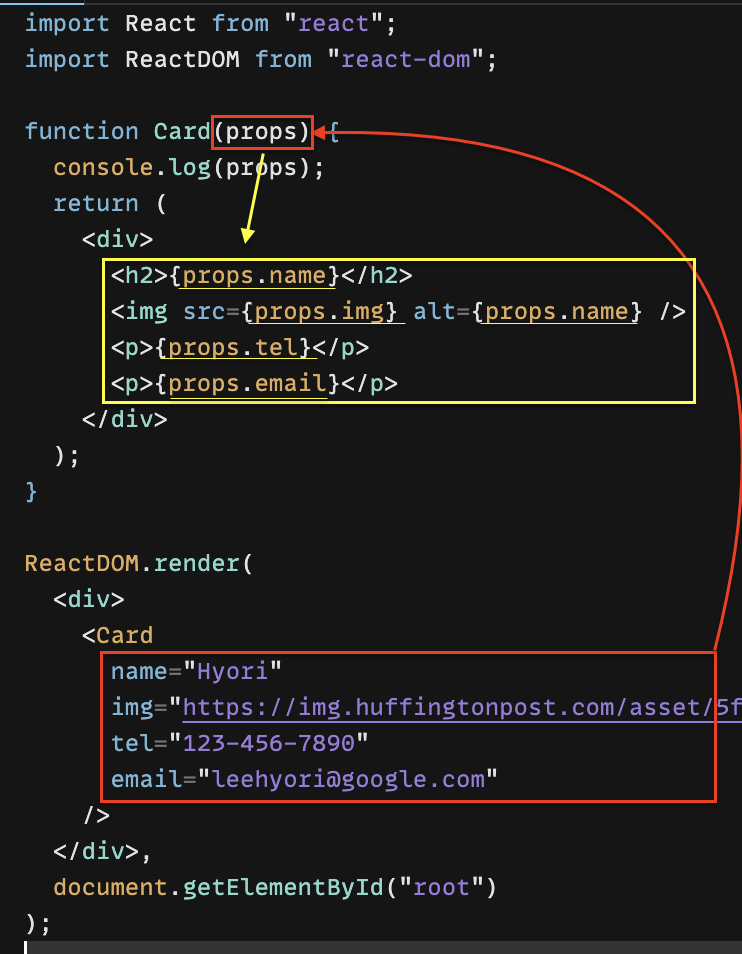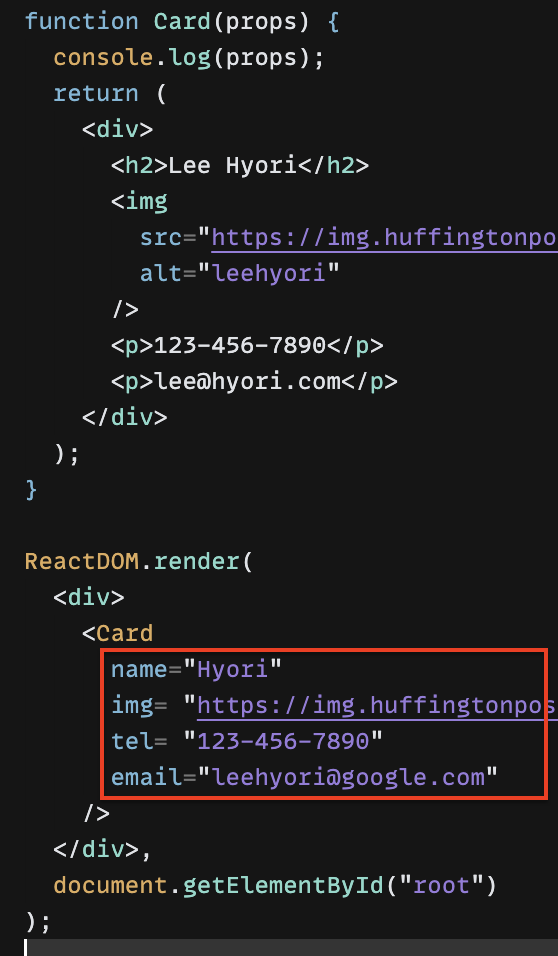 Card 함수에 props를 파라미터로 넣어서 무슨 내용이 있나 살펴보면