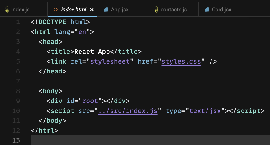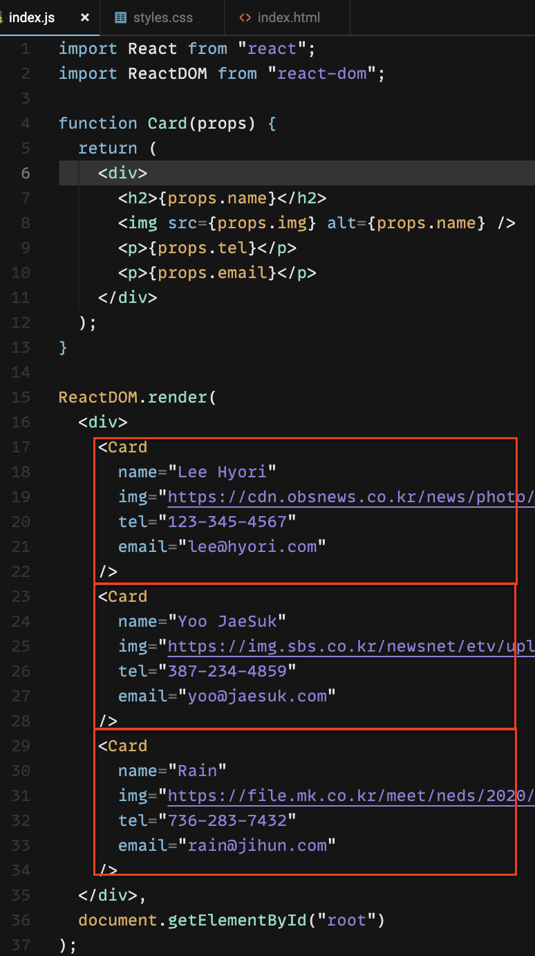 지금 카드 모두는 html 파일 안 body 중에서 'root' div 안에 있다.