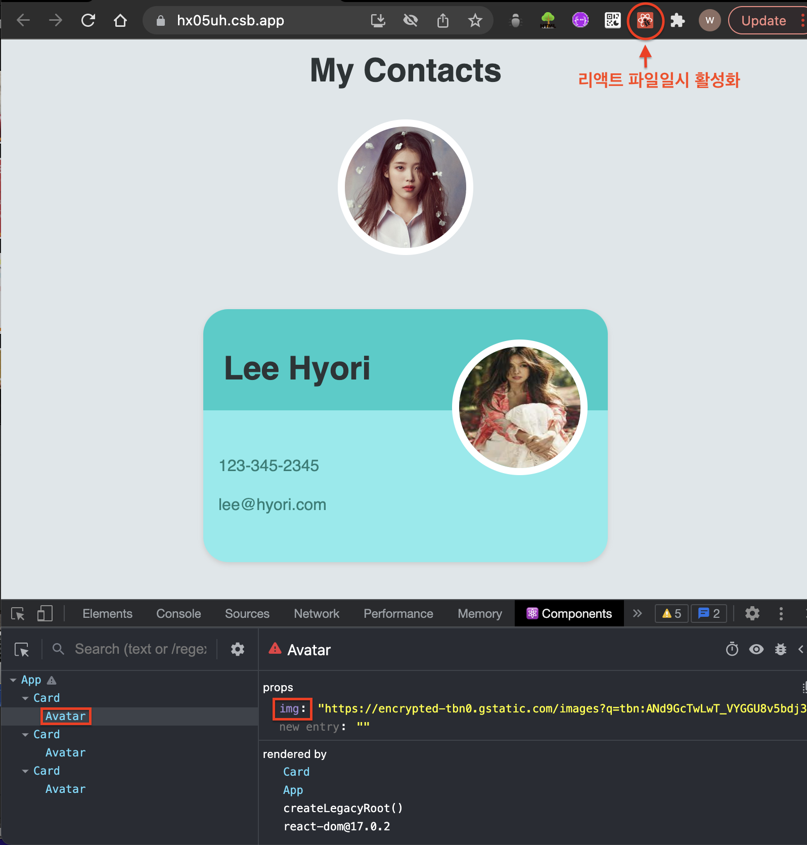 이효리 아바타 이미지 클릭하면 props 가 무엇인지 나오고 source url 도 볼 수 있다.