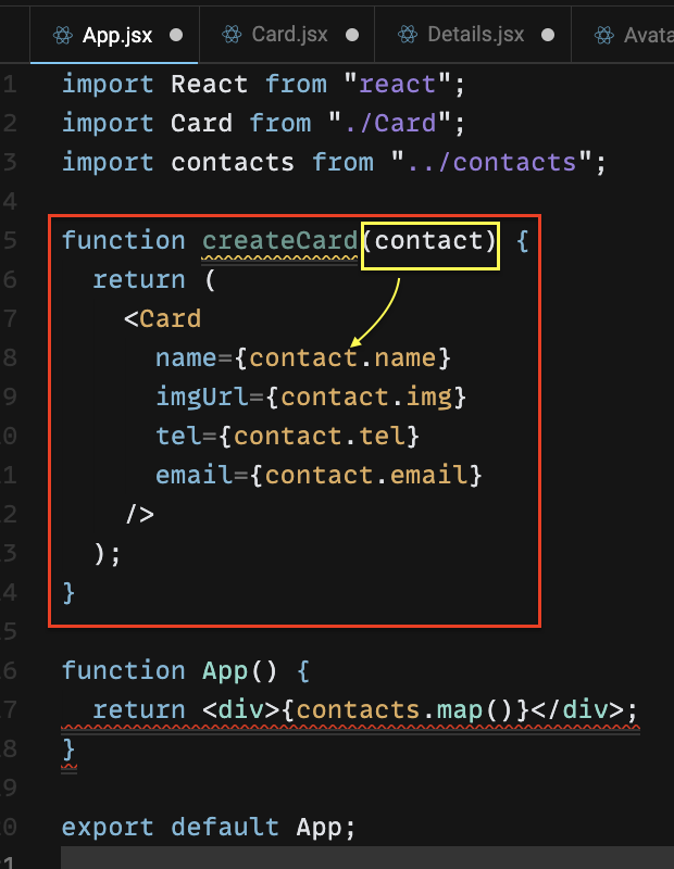 다음은 map 함수 안에서 CreatedCard 함수가 호출 되도록 한다.