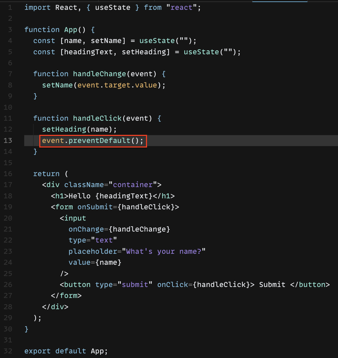 이를 고치기 위해 handleClick()에 event를 파라미터로 받아서 preventDefault를 콜한다.