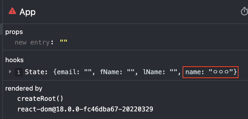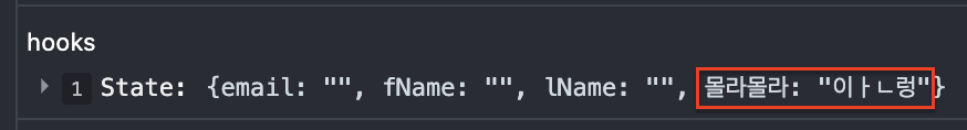 state hooks를 보면 name 키가 새로 생기고 거기에 저장이 되고 있다.
