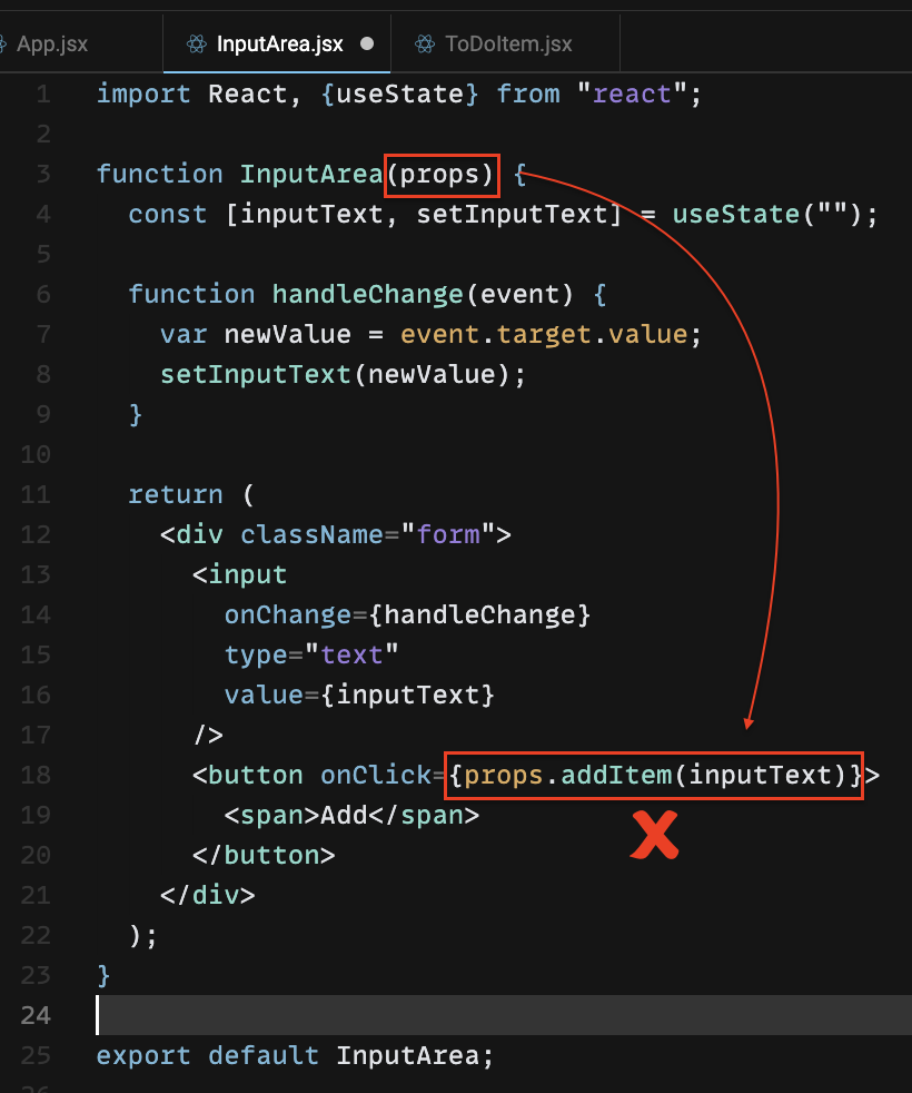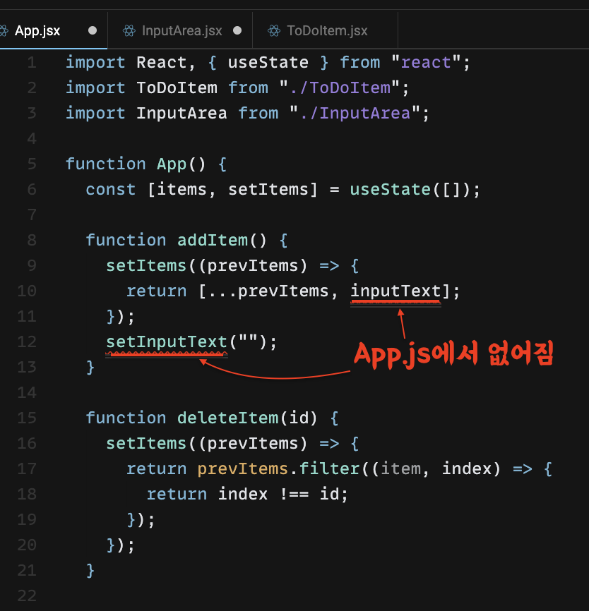 App.js에서 inputText와 setInputText가 없어져서 에러가 남