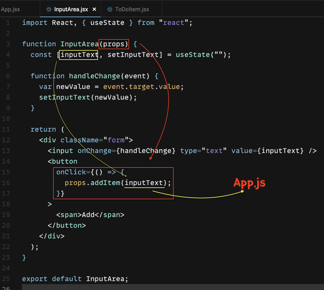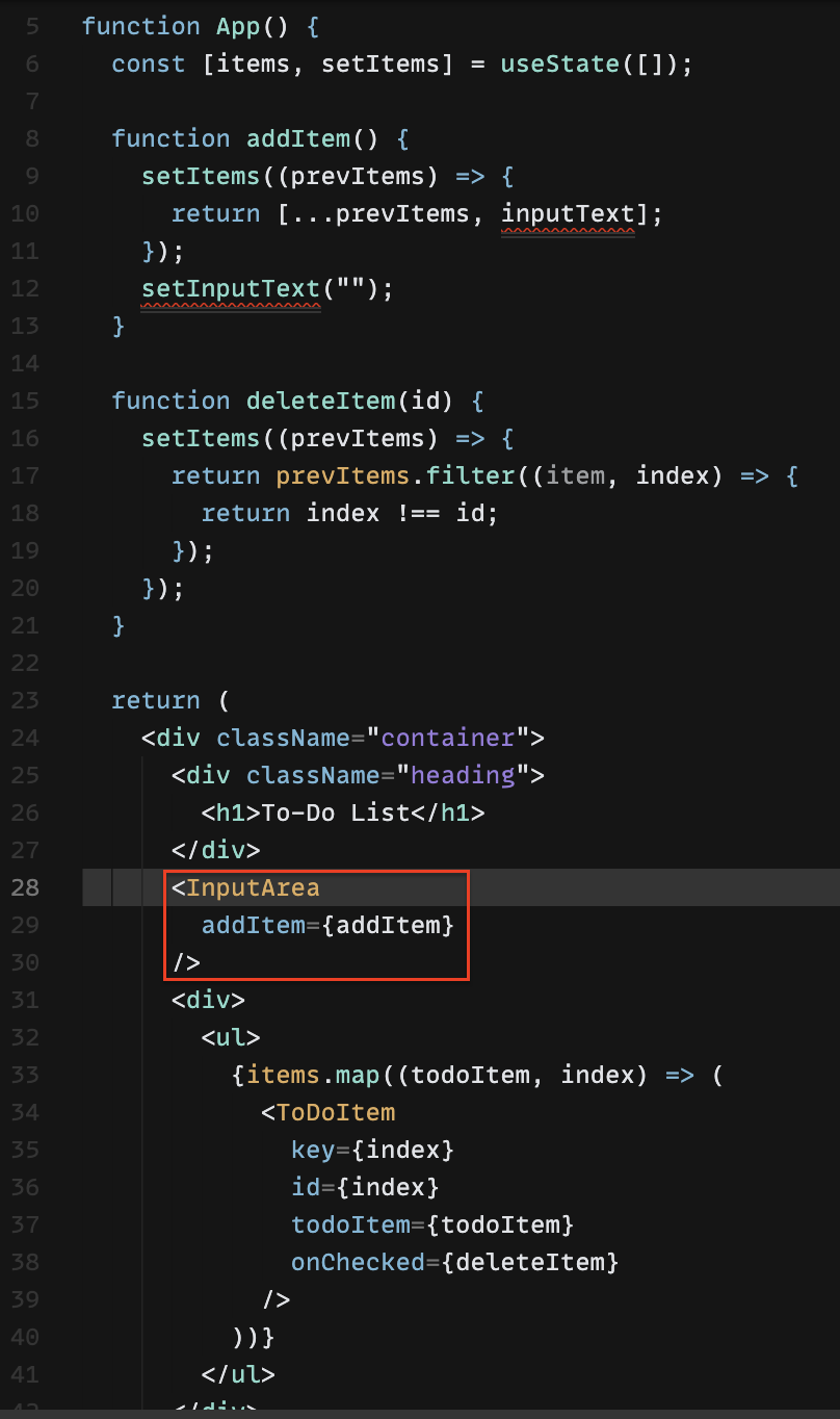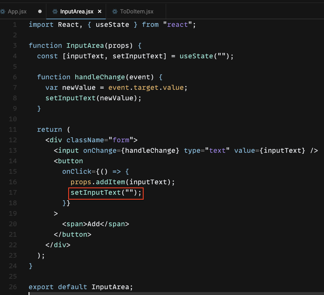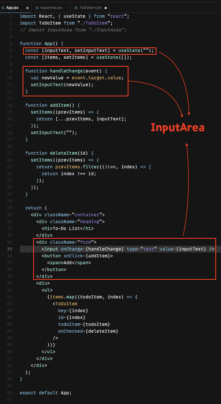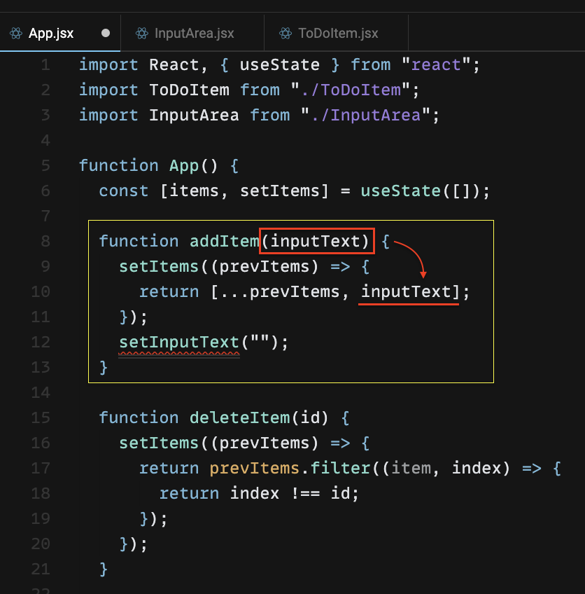 App.js에서 inputText와 setInputText가 없어져서 에러가 남