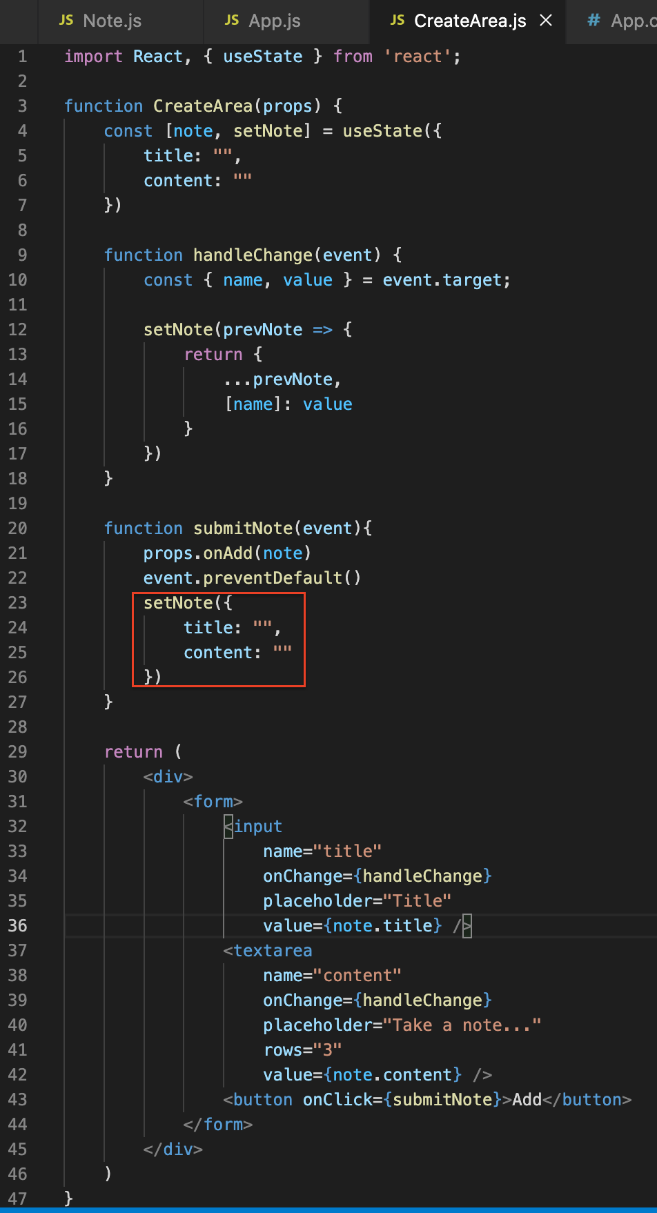 버튼 클릭 되었을 때 note가 addNote함수로 들어오면
