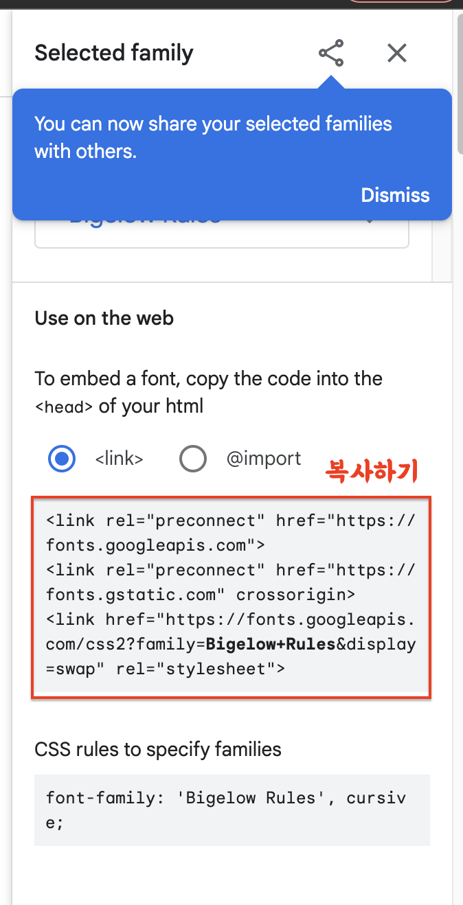 구글 폰트를 검색해 들어가 원하는 폰트를 찾는다.