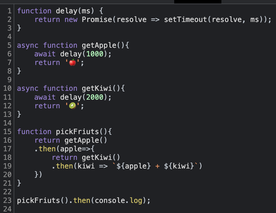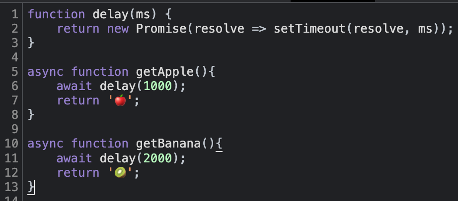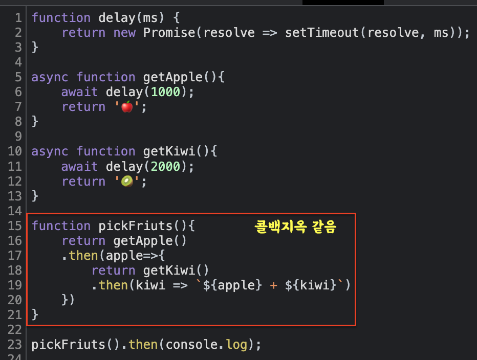 Line 6: await은 delay 함수가 끝날 때까지 기다렸다가 사과 리턴하는 Promise를 만든다.