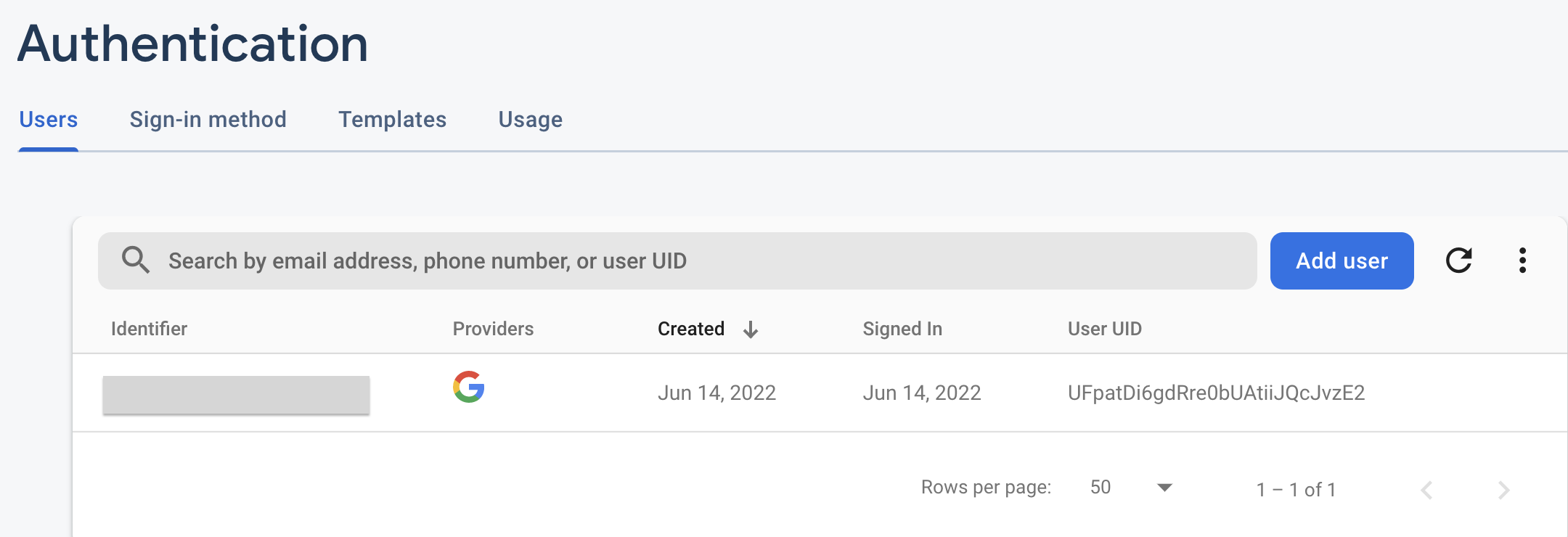 콘솔에 아무 것도 나오진 않지만 Firebase Authentication으로 들어가면 user가 나온다