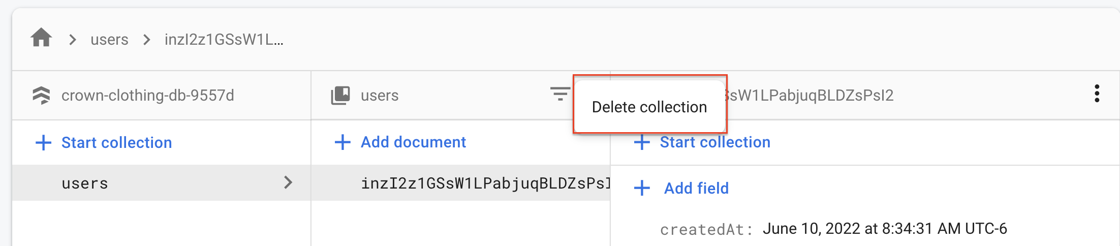앞에서 연습으로 만들어본 users collection을 지운다.