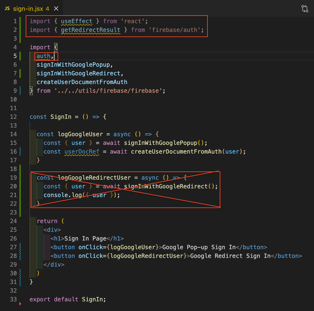 이제는 sign-in 페이지로 가서 SignInWithGoogleRedirect을 import 한 후