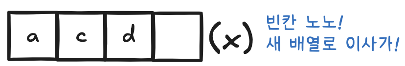 단계 | 현재 배열 크기 | 현재 채운 아이템 수 | 추가 아이템 | 크기 늘림 발생? | 비용 (복사 + 추가) |