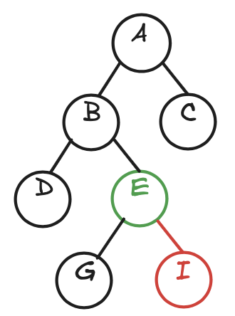A leaf of a tree has no children (Ex: <C>, <E>, and <F>)