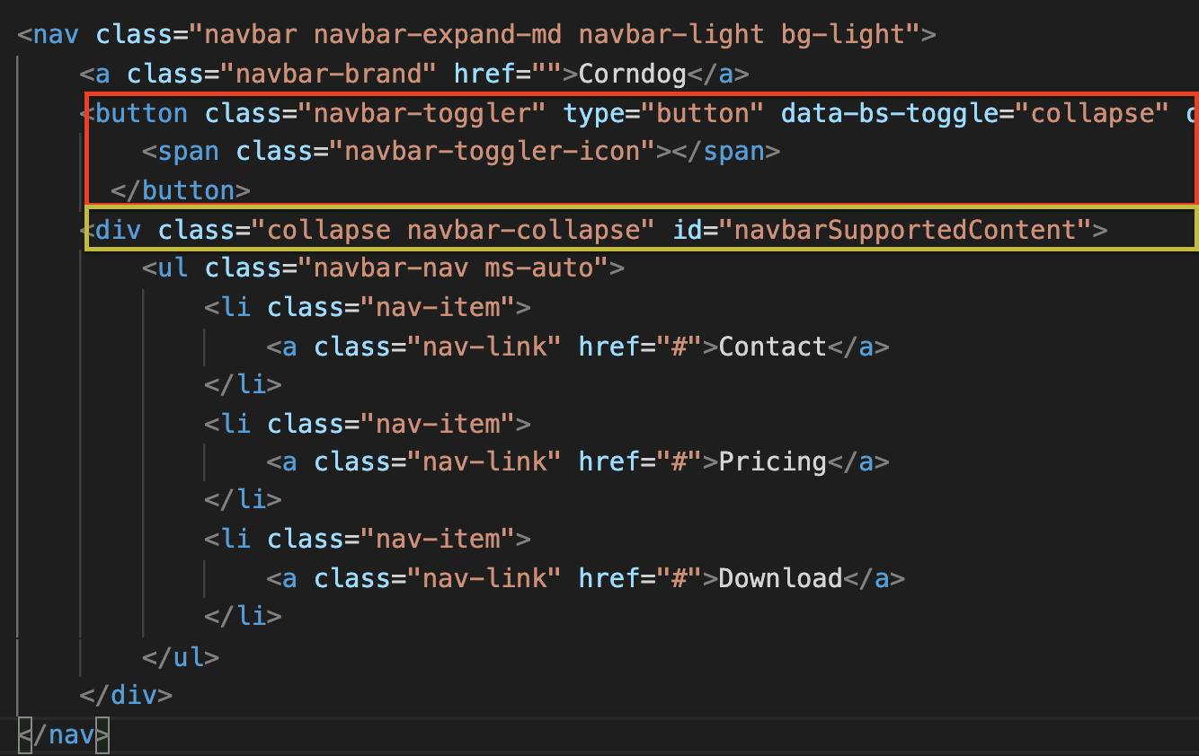 <button class="navbar-toggler" type="button" data-bs-toggle="collapse" data-bs-target="#navbarSupportedContent" aria-controls="navbarSupportedContent" aria-expanded="false" aria-label="Toggle navigation"> <span class="navbar-toggler-icon"></span> </button>