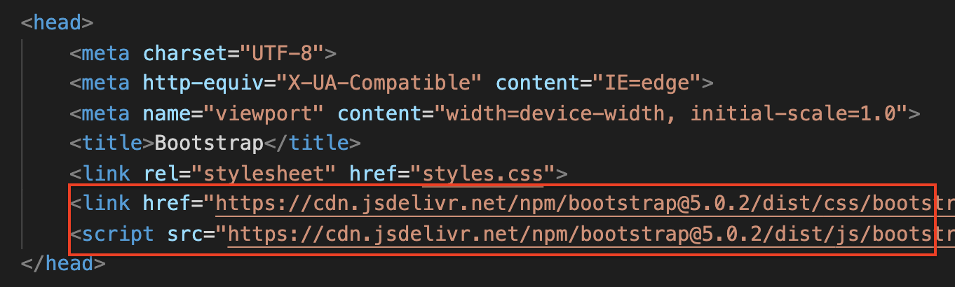 bootstrap 홈페이지에 들어가 Get Startd에 들어가면 나오는 아래 내용을 html head에 넣는다.