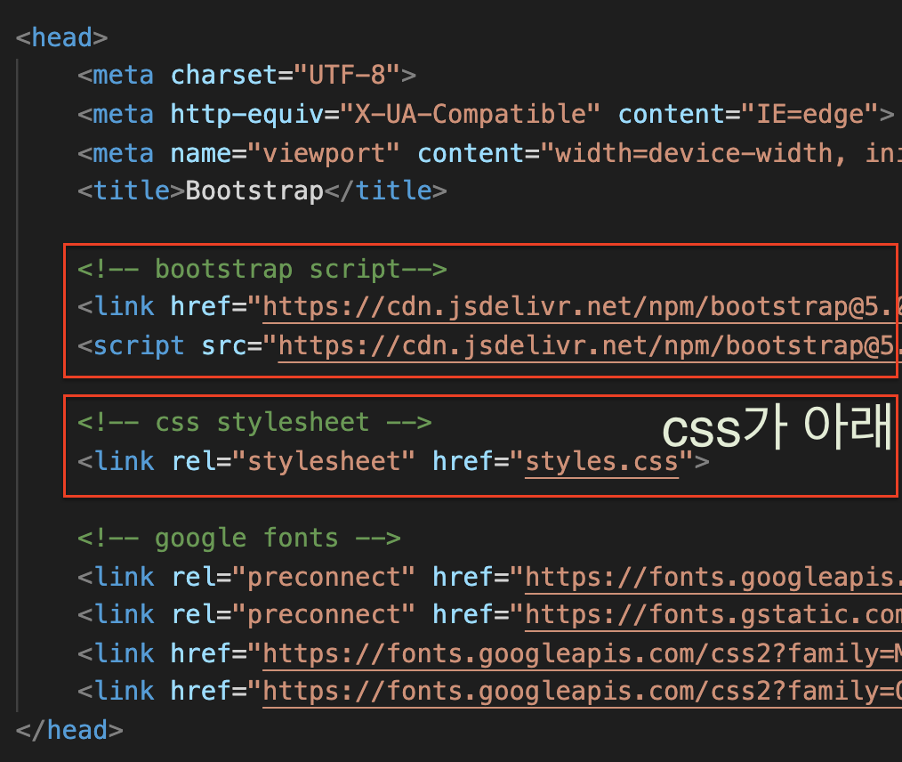 2. 그 전에 html head에서 css 링크가 bootstrap 링크보다 아래 위치해 있어야 css가 적용된다.