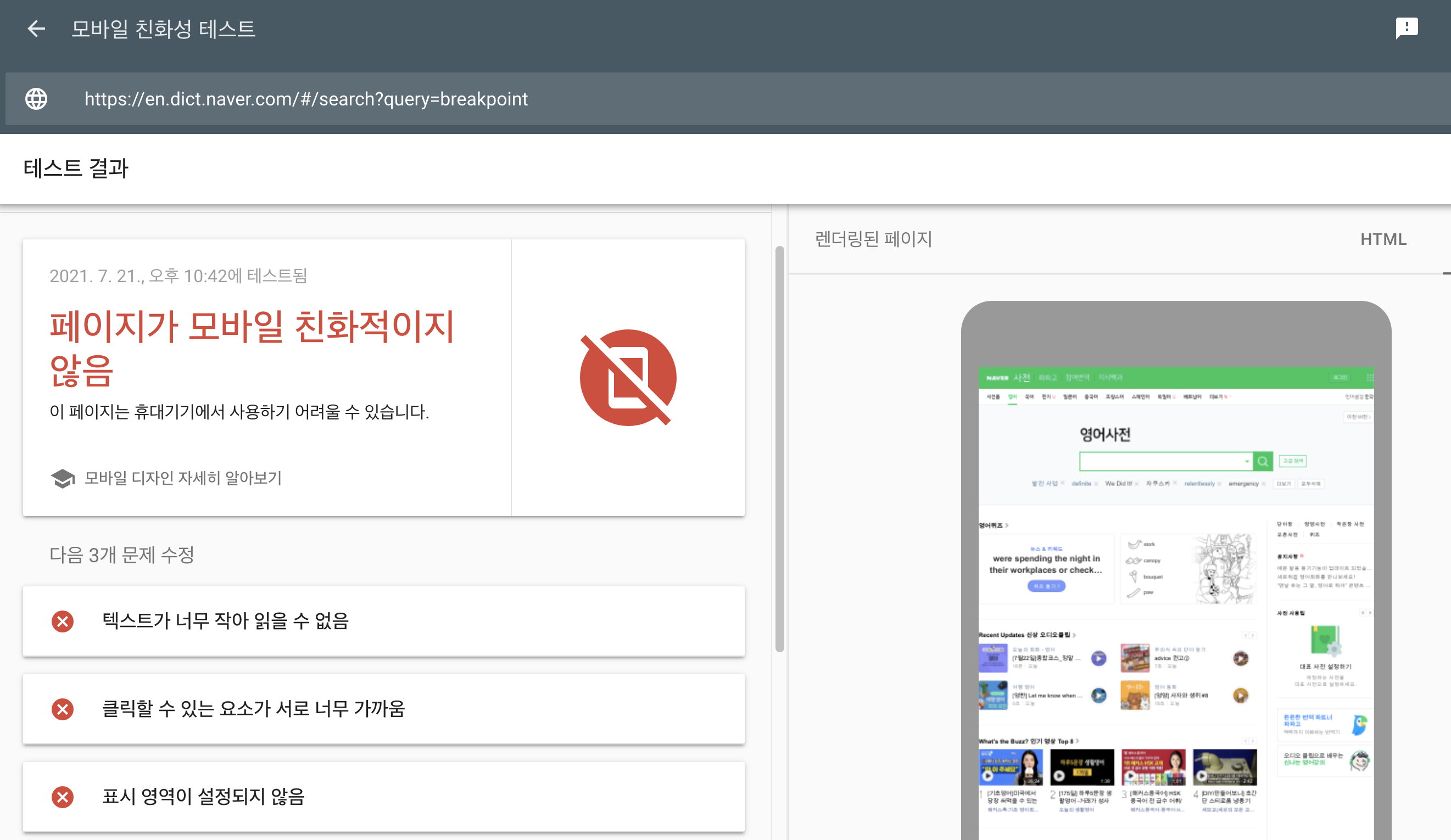 네이버 사전을 데스크탑 주소를 넣었더니 모바일 친화적이지 않다고 나왔다.
