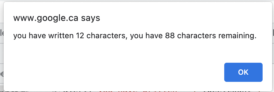 alert("you have written " + tweet.length + " characters, you have " + (100-tweet.length) + " characters remaining.");