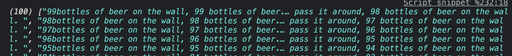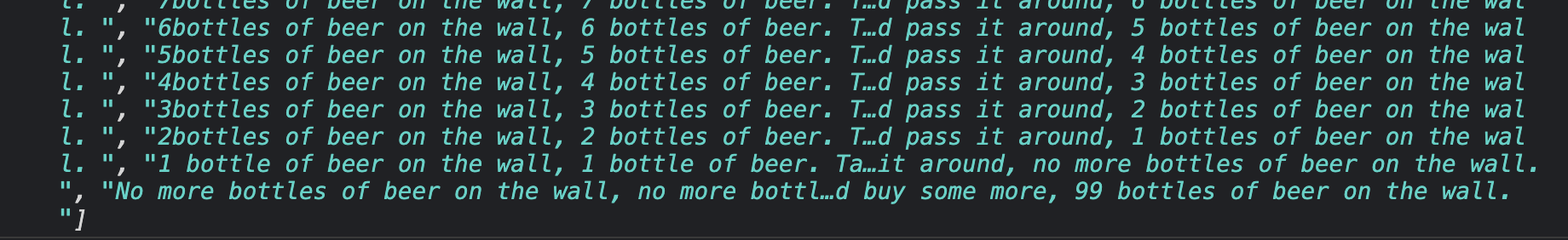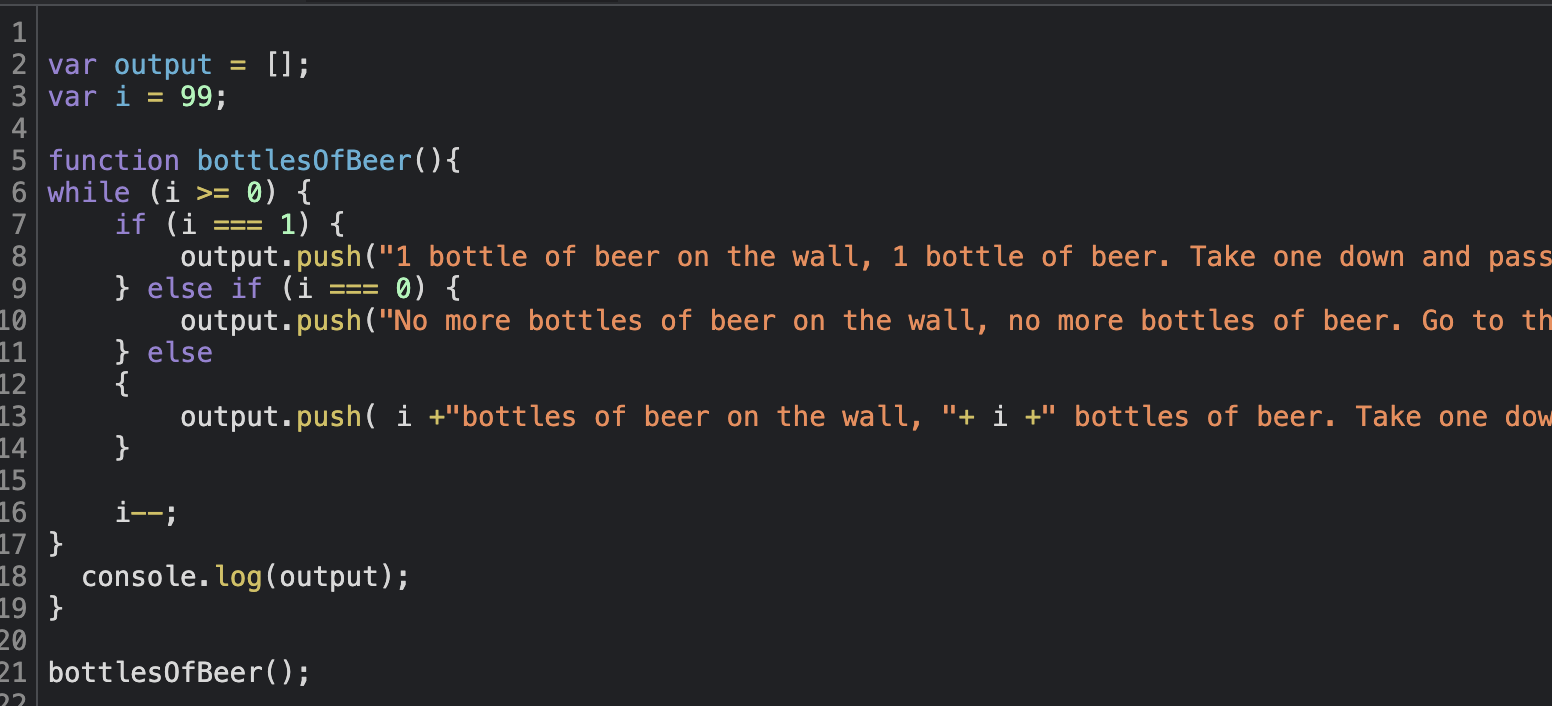 - console.log(bottles + " bottles of beer on the wall, " + bottles + " bottles of beer. Take one down and pass it around, " + --bottles + " bottles of beer on the wall.");