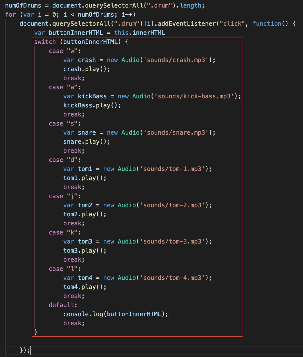 switch 과 new Audio() 이용하여 음원파일 연결한다
