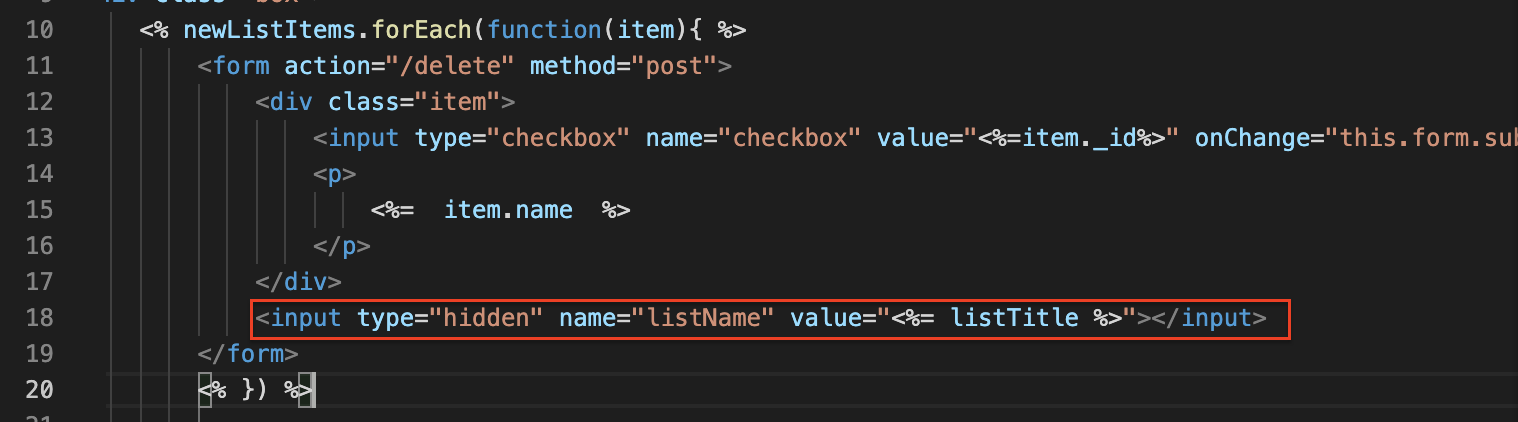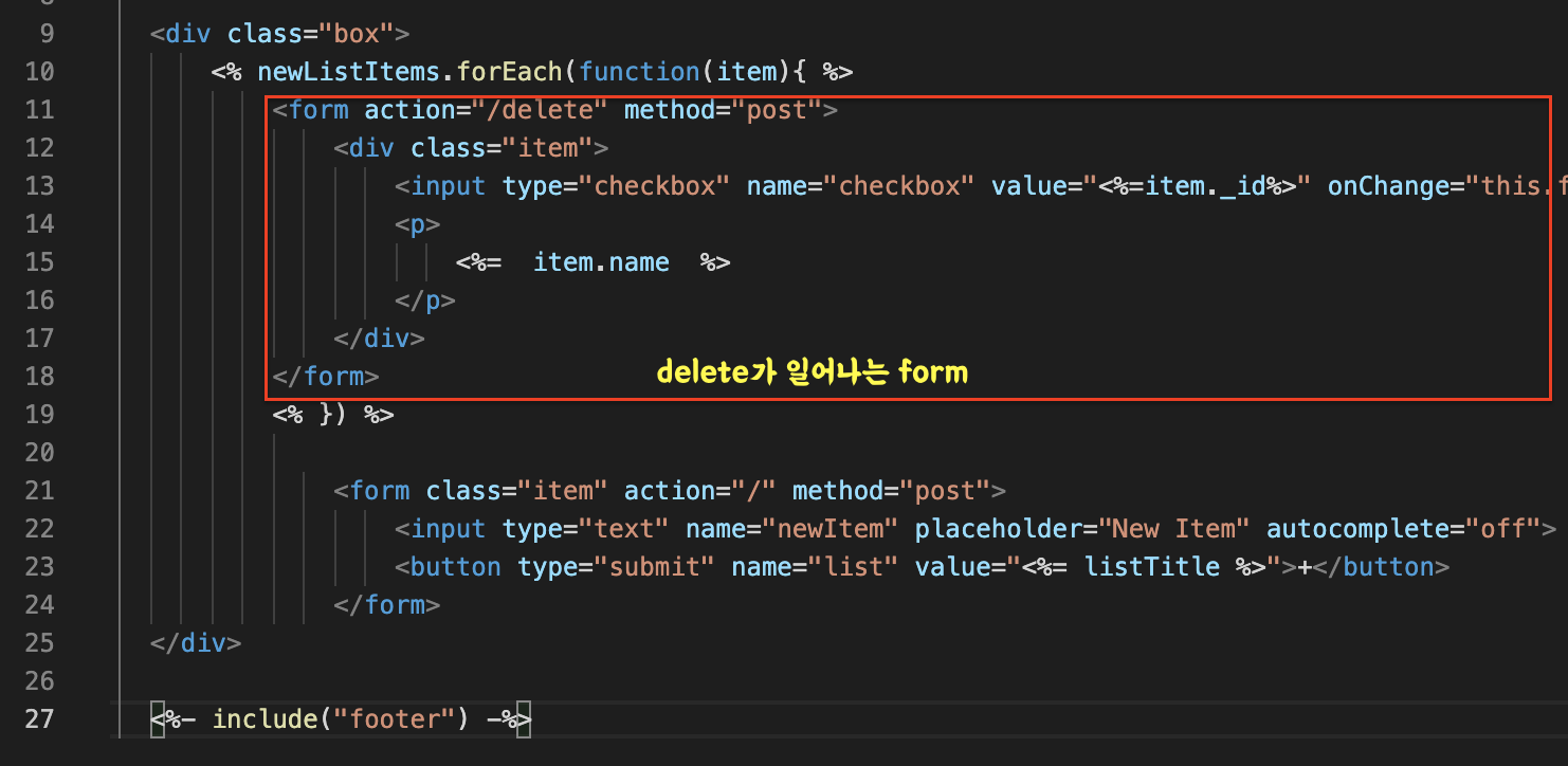 list.ejs에서 delete가 일어나는 form은 다음과 같다.