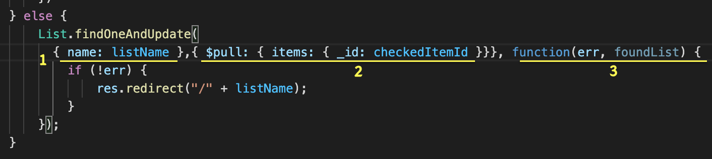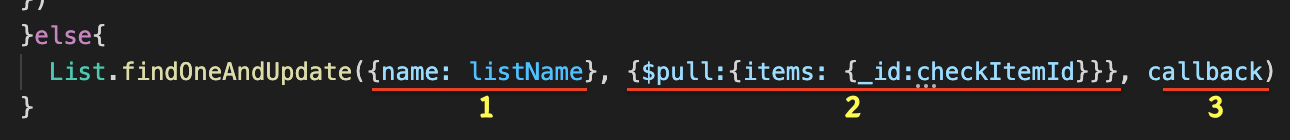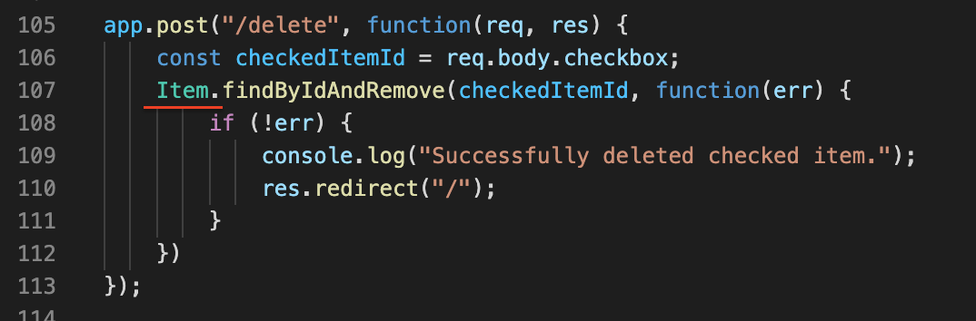 app.js의 delete route에서 우리는 그냥 item 만을 찾도록 설정되어 있다.