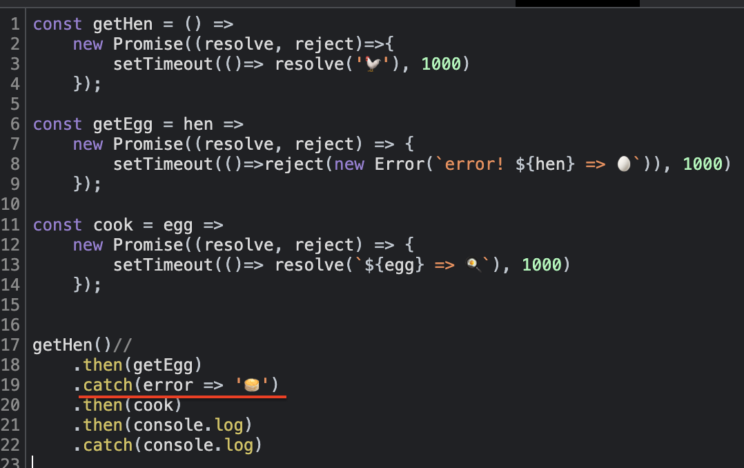 에러 날 수 있는 곳 바로 뒤에 catch 함수를 써서 대체할 내용을 적어준다.