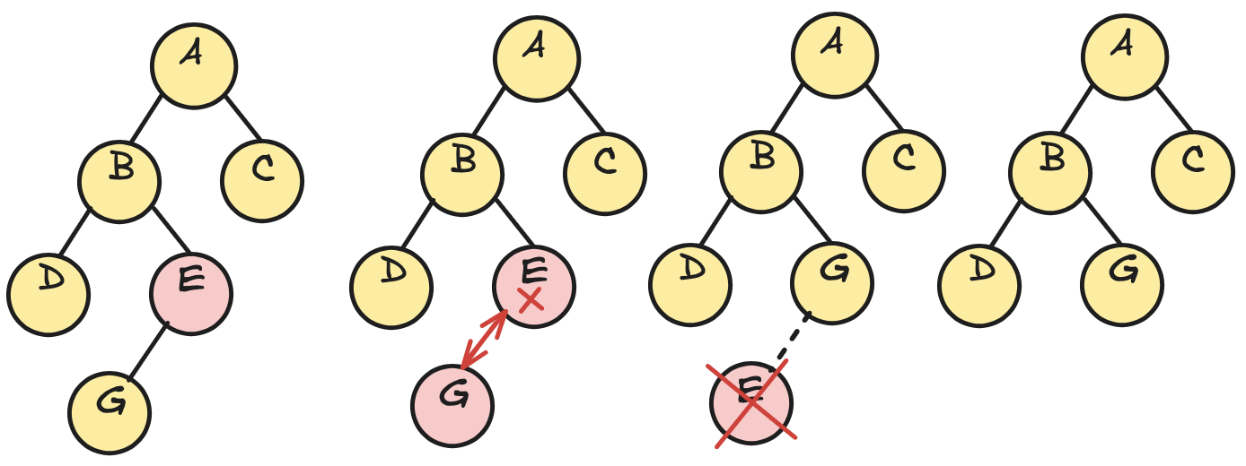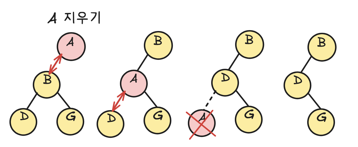 리프를 삭제할 때는 모든 조상 노드의 size에서 −1씩 빼주며 갱신합니다. 이것도 O(h)