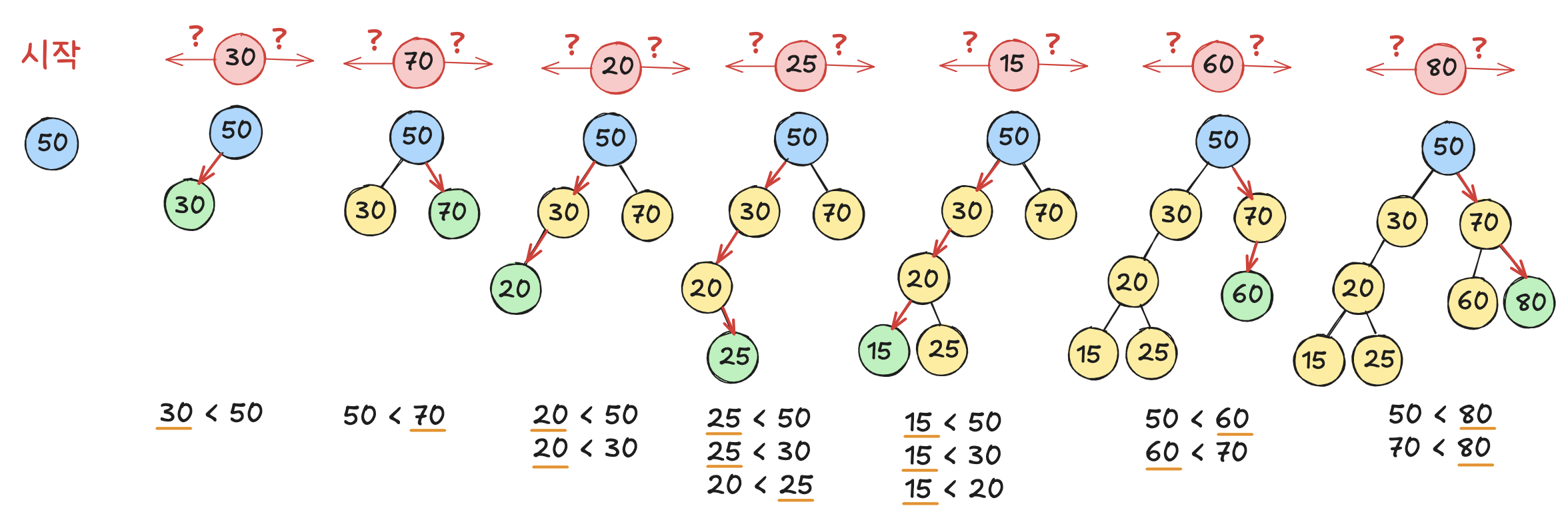 노드 <X>의 왼쪽 서브트리에 있는 모든 노드는 <X>보다 작다