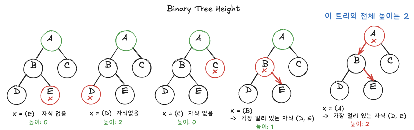 * 높이: 노드 x에서 아래로 가장 멀리 떨어진 자식까지의 거리