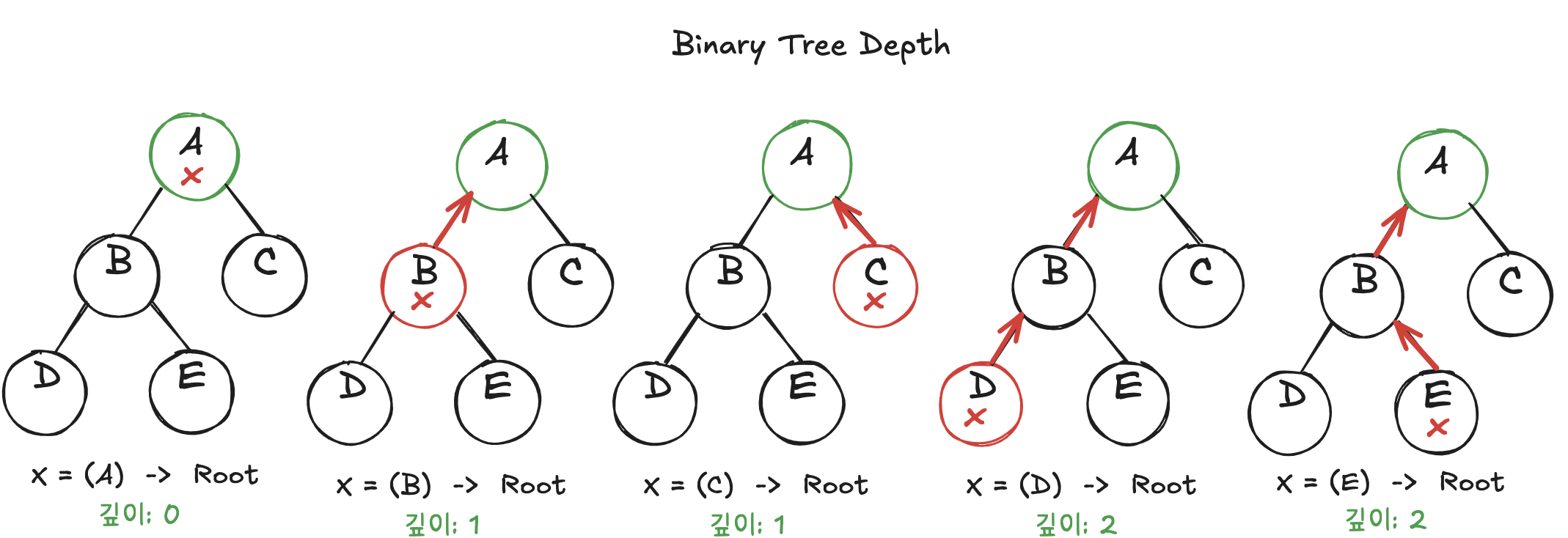 | Node X | X 부터 -> 루트까지 | 깊이 (depth) |