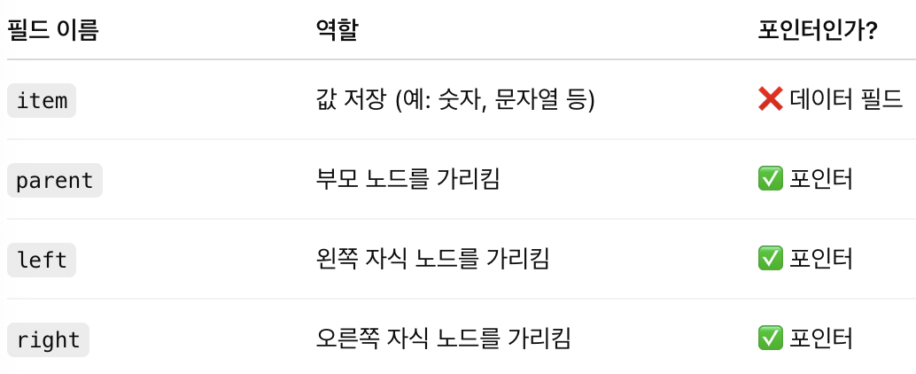 바이너리 트리도 포인터 기반 자료구조로 되어 있으며, 각 노드는 3개의 포인터를 가진다.